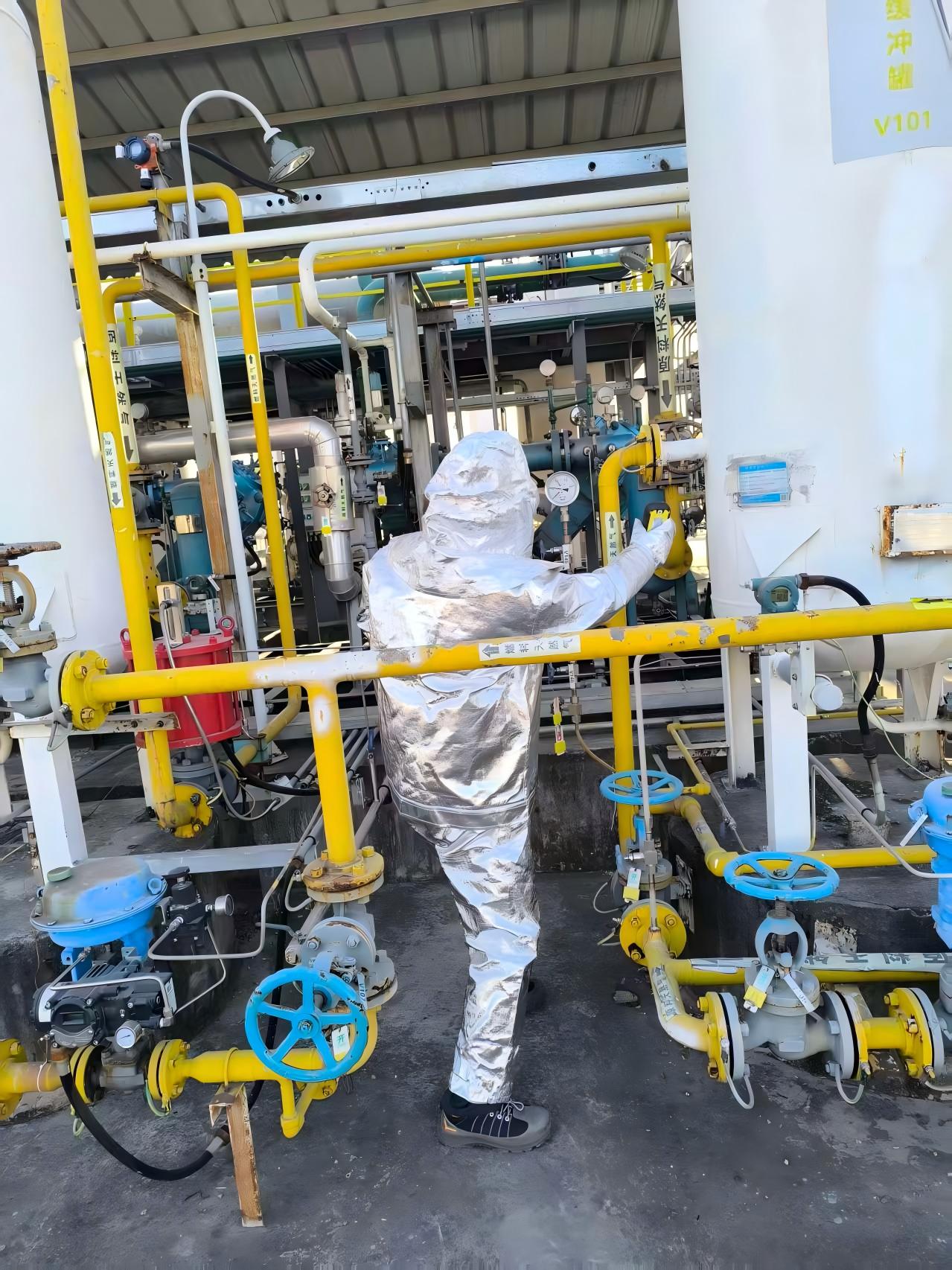 設備技術員孔朝輝更換原料氣緩沖罐法蘭墊片,并對泄露法蘭重新緊固。檢查泄漏緩沖罐過火情況、周邊設備損壞程度,向制氫站站長李云建議:“受高溫影響,原料氣緩沖罐及周邊的管道需進行壓力試驗,確認安全后,方可重新開機。”