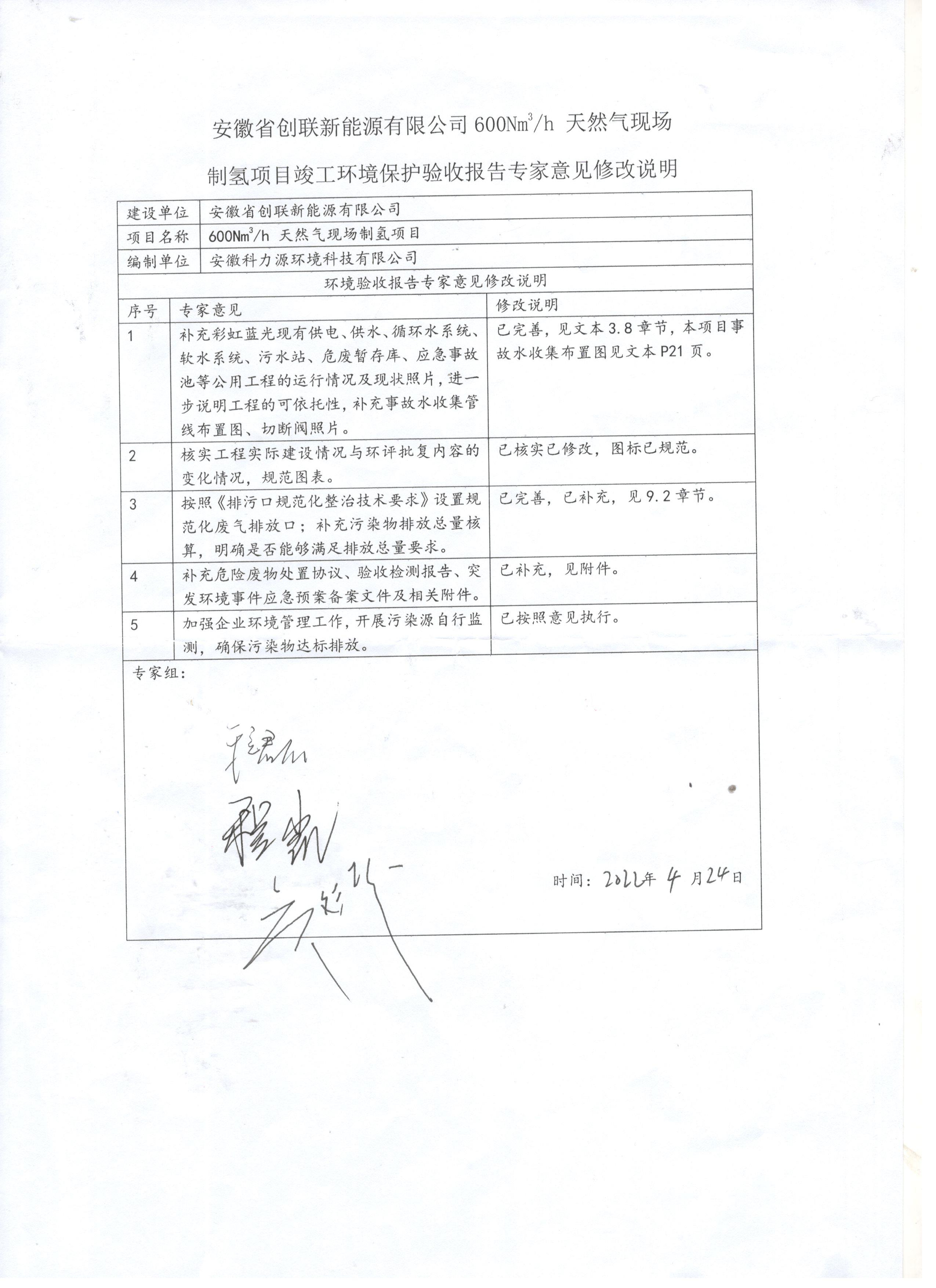 安徽省創(chuàng)聯(lián)新能源有限公司600Nm3/h 天然氣現(xiàn)場制氫項目驗收組嚴格依照國家有關(guān)法律法規(guī)、建設(shè)項目竣工環(huán)境保護驗收技術(shù)規(guī)范、本項目環(huán)評報告書和審批部門審批決定等要求對本項目進行驗收。驗收組認為本項目實施工程按照環(huán)評及其批復(fù)的要求,落實了相關(guān)環(huán)保設(shè)施,建立了相應(yīng)環(huán)保管理制度,符合環(huán)保驗收條件,可通過環(huán)保驗收。根據(jù)《國務(wù)院關(guān)于修改<建設(shè)項目環(huán)境保護管理條例>的決定》(國務(wù)院令第682號),以及環(huán)境保護部《關(guān)于發(fā)布<建設(shè)項目竣工環(huán)境保護驗收暫行辦法>的公告(國環(huán)規(guī)環(huán)評[2017]4號),現(xiàn)安徽省創(chuàng)聯(lián)新能源有限公司600Nm3/h 天然氣現(xiàn)場制氫項目竣工環(huán)境保護驗收報告公示如下: