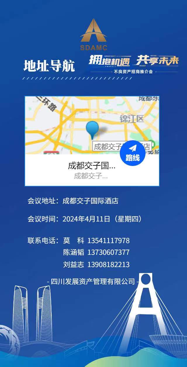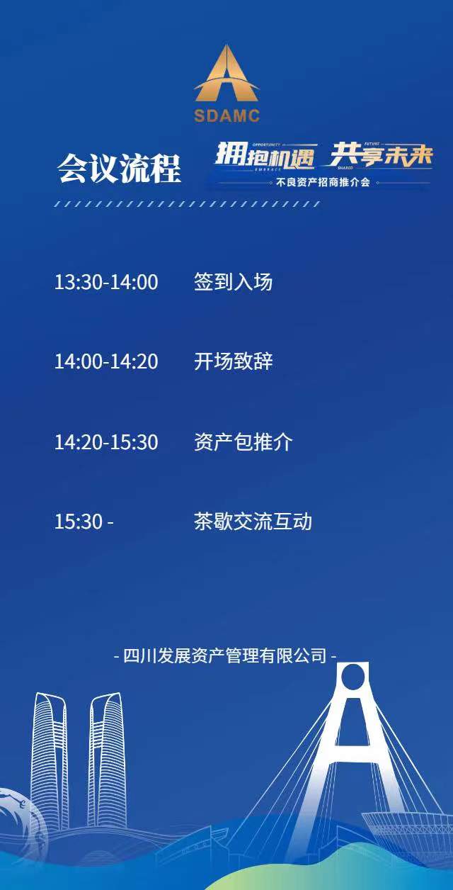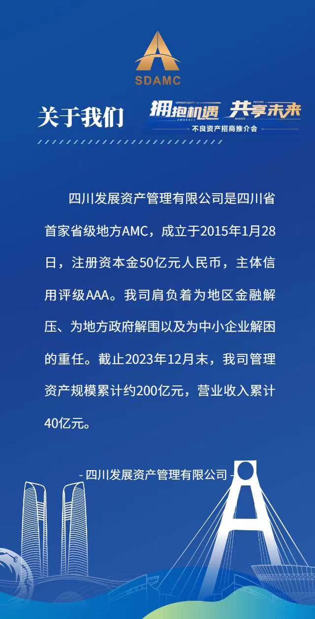 4月11日,四川發(fā)展資產(chǎn)管理有限公司將在成都高新區(qū)交子國際酒店舉辦“2024年不良資產(chǎn)招商推介會(huì)”,誠邀您的參與。